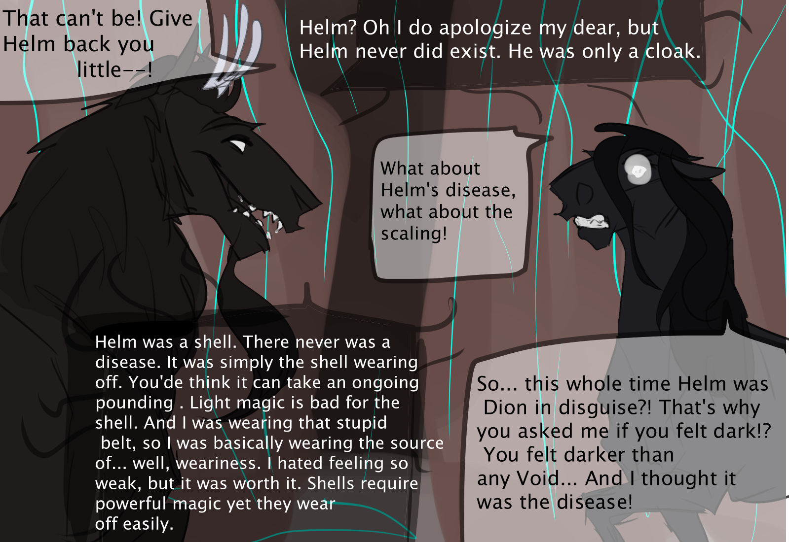 Okay I'm back. Still haven't gotten over this. ;-; Let me just tell you something... this comic is AMAZING, ABSOLUTELY AMAZING and you totally need to get it published. And I was so hooked in this one I swear! ;-; Gosh where do I start? :'D Just need to re-read it again. Aaah Lenore is so brave I love her!! ;-; Honestly when Sputnik came in I started fangirling. I love that guy so stinking much. To bits. C': Eeeeep I love the Lenore x Odin ship so muuuuch!! <3 why. ;-; And ahhhhh there's SO much mystery and suspense in this and so many different perspectives I love it too much!! :'D And oh my God. Sahail... Sahail the void! ahhhhhhh this is too much!! Omigosh this is SO emotional!! I got so attached I can't express it enough! ;-; OKAY BUT THAT BIT WHERE HELM TURNED INTO KING DION REALLY GOT ME THERE omigosh no ;-; WHy aRe wRiTERs sO CRuEL??? why. why!! ;-; I totally didn't see that coming I swear. Oh gosh. I remember you hinted it in that piece of artwork but I thought he'd just been turned into void... this has given me even more feels! D': noooooooooooooooooooooo!!! Evil writers. ;-; AND GOODNESS IT'S SO SINISTER!! I can't even! ;-; ahhhhhhhh (lol that face though x'D) The heck, you just made me love Helm/King Dion even more! *-* KING DION IS AMAZING HOW!?! Everything he says there! So formidable. *-* So dang classy ;-; Holy cow that backstory is the best thing I've ever seen. How did you write it? It's SO emotional and overly gripping and I feel like I've been sucked in and everything clicked into place so well and I just- O.O Okay but the fact that you knew all of this from the very beginning (last year I know bc I want to mention something about that later~ xD) makes me want to re-read from the beginning all over again because this comic is SO powerful I'm not even kidding. o.o And *cries* SPUTNIK YOU'RE TRULY AMAZING YOU!! ;-; poor guy. I feel so much sympathy for him. *sobs* I don't even know what to say. ;-; (as for the "I am your father" thing all I can imagine is Alia... okay nevermind x'D) This really hit me in the feels... you're so mean. ;-; That ship though. Sputnik and Alia. I died. So emotional. why. ;-; it's true love, people! ;-; Cuties. <3 (now you just gave me a new OTP... the feels ;-;) I LOVE SPUTNIK SO MUCH HE'S SO BRAVE AND EVERYTHING!! :'D <3 (and harr welp ;-;) Oh gosh I love that quote so much "Then he intruded on my domain, everyone! The invincible Sputnik, rudest stallion in the world!" everything Dion says is GOLD! *O* Heck Alia's expressions match mine all to well... I feel her. Gosh. And the story behind the curse mark... there goes my feels again! ;-; Poor cuties. ;-;